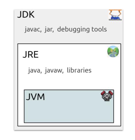 The JDK is a folder that contains a collection of software tools you can use to develop Java applications. By default, it includes JRE and JVM. An an analogy, JDK is a manufacturing facility with assembly lines, car parts, and a test roads.