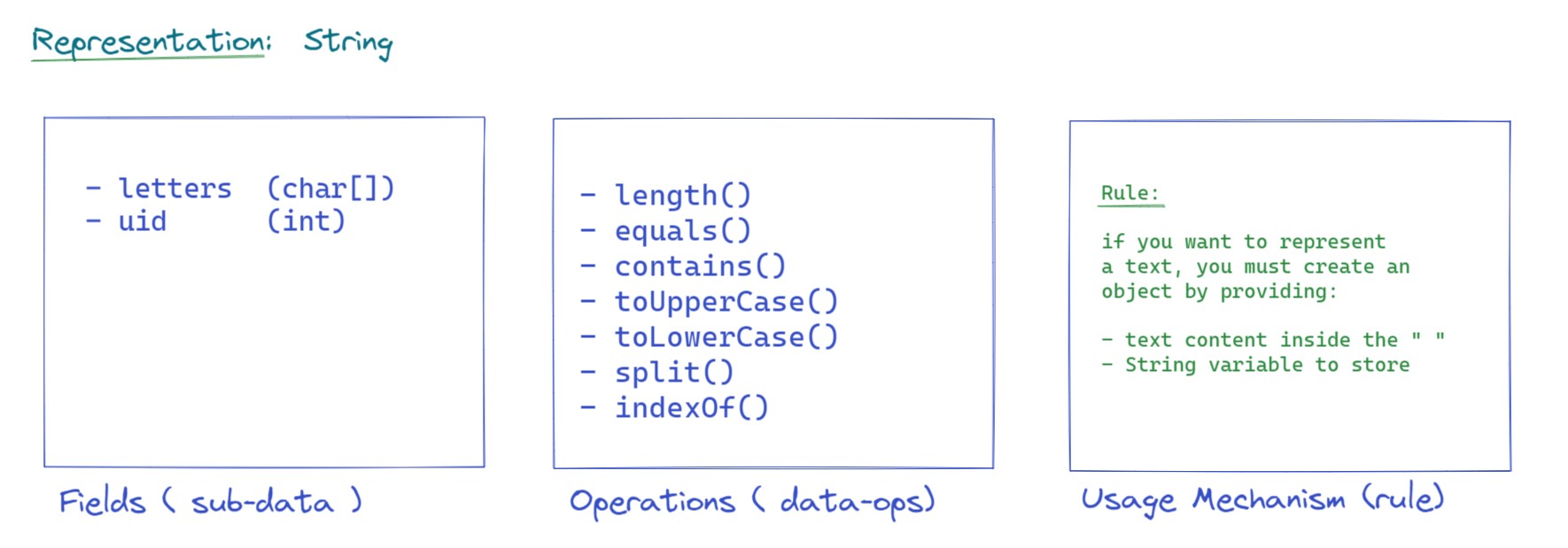 For example for the String.java class that represents textual data, we can use in our Java program by creating an Object from the class as follows: