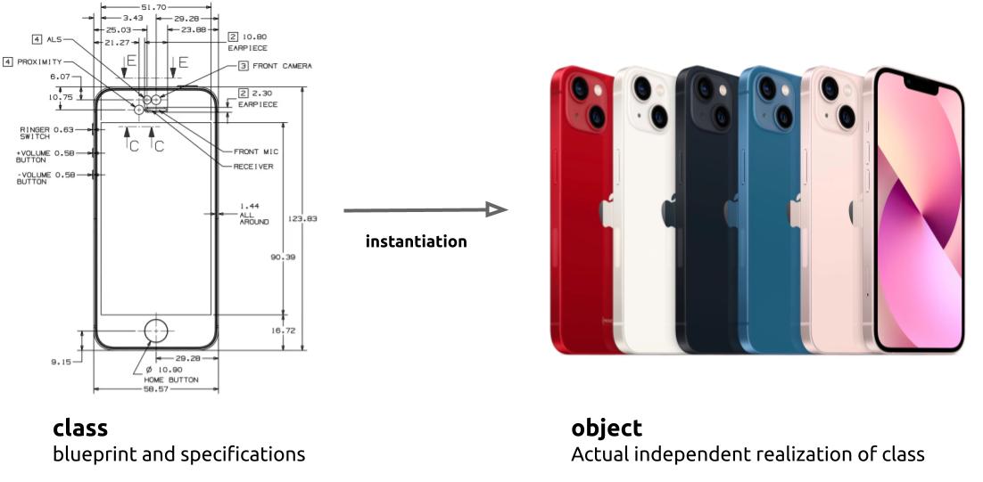 To give you an analogy, if you want to use iPhone, first someone has to design and represent what an iPhone is. Based on the design, then it can be manufactured and used as an iPhone object. This creation and usage of object based on its specification is called instantiation in programming.