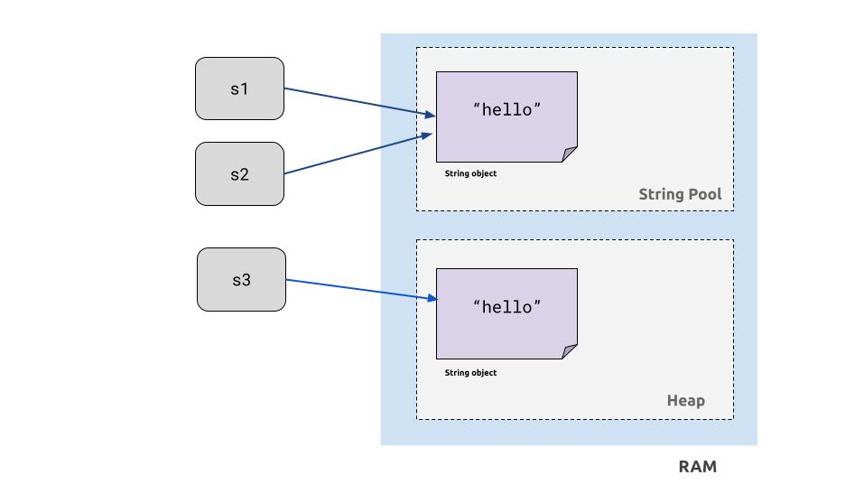 s1 and s2 will points to the same String object, meanwhile the s3 points to its own String object. This can be visually expressed as follows.