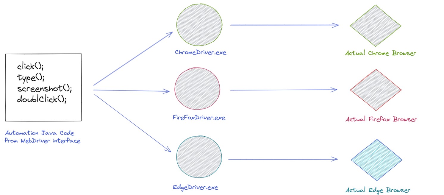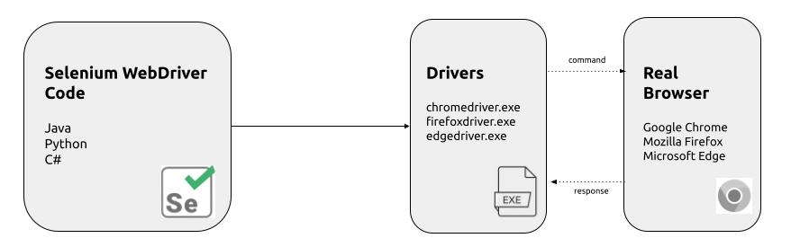 All Selenium code you write must pass through the running driver software to reach the actual browser. Each browser has its corresponding driver software that sends automation commands to the actual browser. Selenium allows us to work with this driver software through its WebDriver interface.