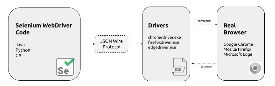 This version of Selenium uses JSON Wire Protocol to interact with drivers. JSON Wire Protocol specifies how the automation Java code ( clicking, typing, etc.) should be relayed to the driver software.
